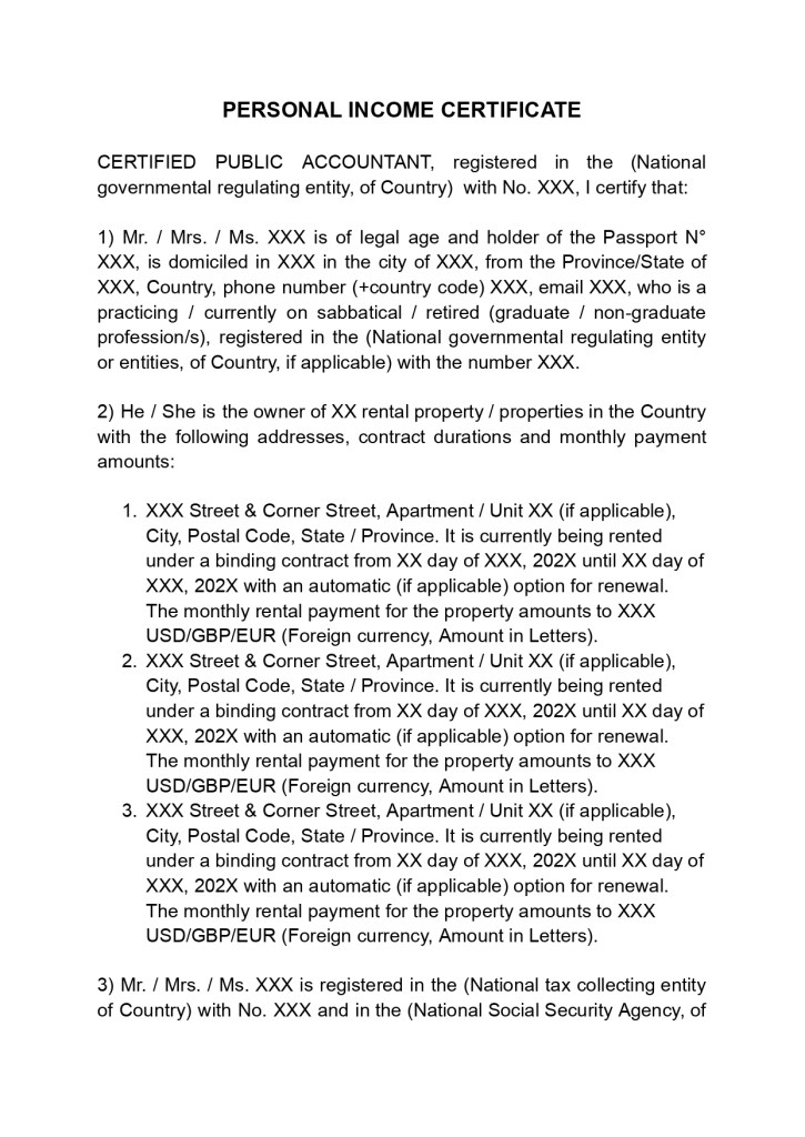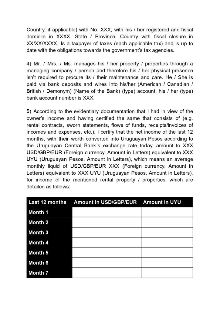 5) According to the evidentiary documentation that I had in view of the owner’s income and having certified the same that consists of (e.g. rental contracts, sworn statements, flows of funds, receipts/invoices of incomes and expenses, etc.), I certify that the net income of the last 12 months, with their worth converted into Uruguayan Pesos according to the Uruguayan Central Bank´s exchange rate today, amount to XXX USD/GBP/EUR (Foreign currency, Amount in Letters) equivalent to XXX UYU (Uruguayan Pesos, Amount in Letters), which means an average monthly liquid of USD/GBP/EUR XXX (Foreign currency, Amount in Letters) equivalent to XXX UYU (Uruguayan Pesos, Amount in Letters), for income of the mentioned rental property / properties, which are detailed as follows: