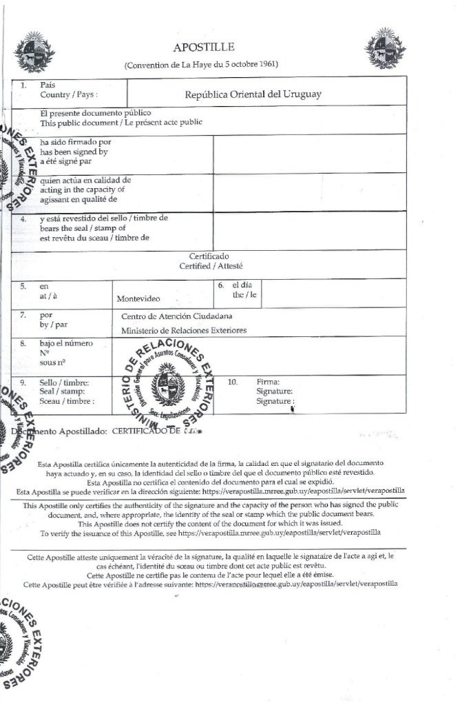 The issuance of a Uruguayan apostille for a Uruguayan document or a legalization for a certification from a Uruguayan Embassy at jurisdictions that aren’t members of the Apostille Convention (such as Cuba) or for certain documents that otherwise can’t be apostilled fall under the purview of the Uruguayan Department of State located in Montevideo.